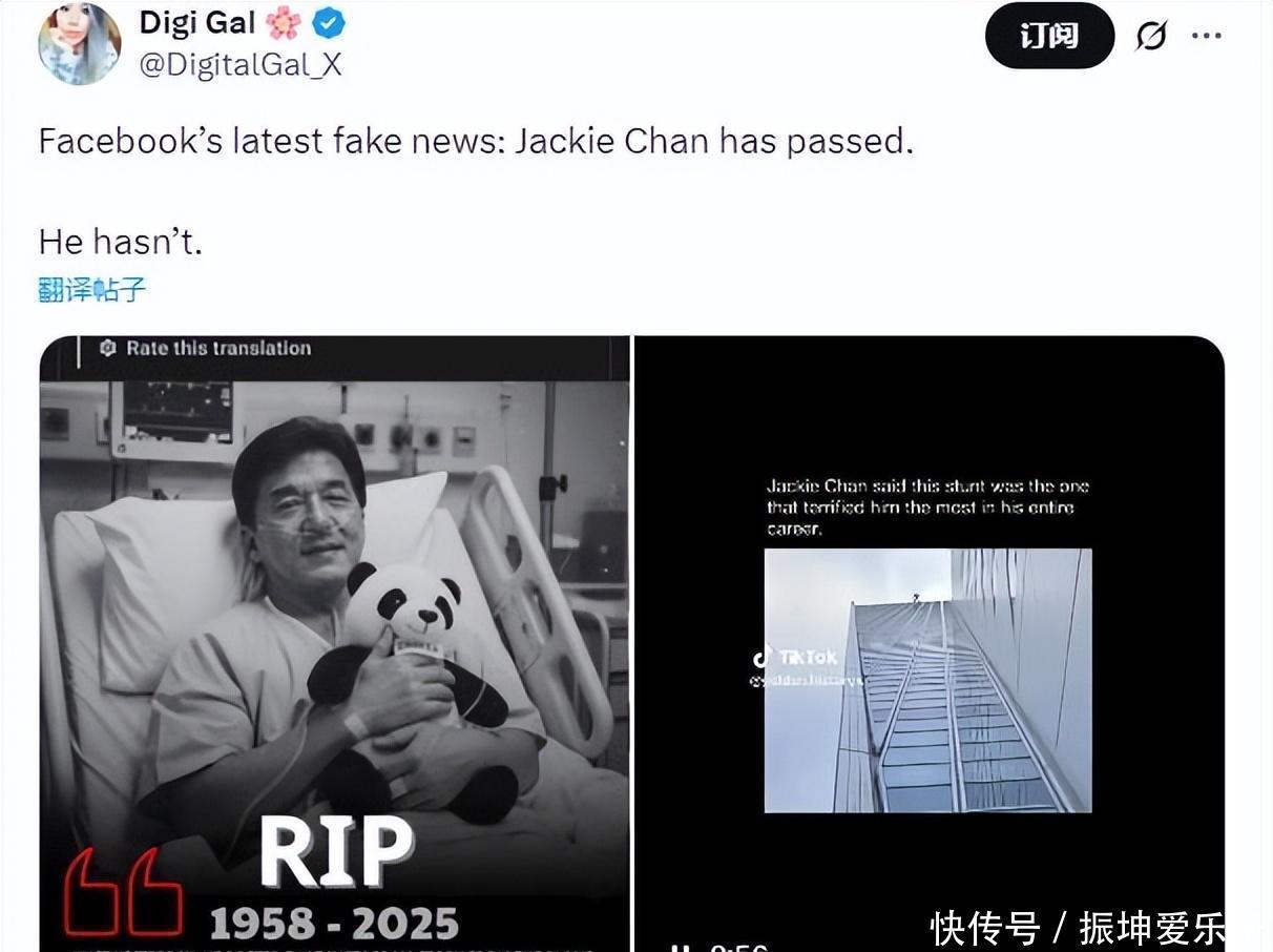 71 岁的成龙哪有空闲着,还在片场忙活呢。除了刚官宣的新片,之前的《捕风追影》刚上线,票房破 12 亿,评分也高,大家都夸他动作戏还那么利索。还有和外国演员合作的电影 12 月要上,预告片里他跳货车顶都不用替身,还是那股拼命劲儿。之前传他头发白了显憔悴,大哥早说了那是拍戏的造型,每天要花俩小时弄头发,不是真样子。 不光成龙,韩红之前也被造谣 “重病”,上百个假视频到处传,把她 80 岁的妈妈都吓哭了。韩红赶紧发文说自己身体好好的,还在做音乐、做公益,那些代言产品的说法都是假的。这些造谣的就是盯着名人热度,编生死相关的瞎话博流量,根本不管别人受不受伤。还好他们都用行动反击了,希望这种 AI 造谣的破事赶紧消失,我们还等着看成龙大哥的新电影呢!