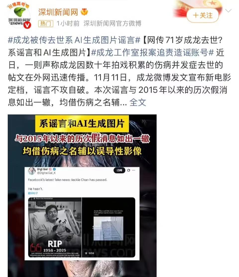 网上突然冒出成龙 “没了” 的假消息,配着张 AI 做的病床图,图里他脸色惨白躺着,连 “生病并发症走了” 的瞎话、编的日期都弄得有鼻子有眼。才半天功夫,这事儿就窜上热搜第一,2 亿多人急着核实,连国外媒体都差点跟着瞎报。还好官方连夜澄清是假的,说图片是合成的,更实在的是 11 月 11 号成龙自己发微博说新片要上了,拍戏挺顺利,用正儿八经的工作状态打了造谣的脸,这时候大家才想起韩红之前也遇过这事,她当时说的,谣言对自己和家人的伤害,真的比想的重多了。